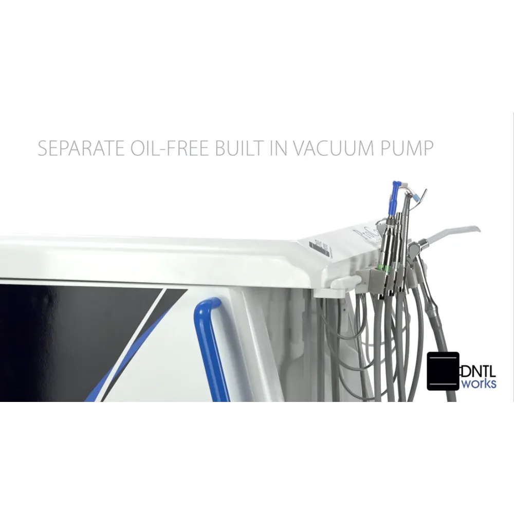 - Triple Oil-Free Pumps: Compressor (handpieces, syringe), vacuum (HVE, saliva ejector), and waste purge—hands-free and reliable.