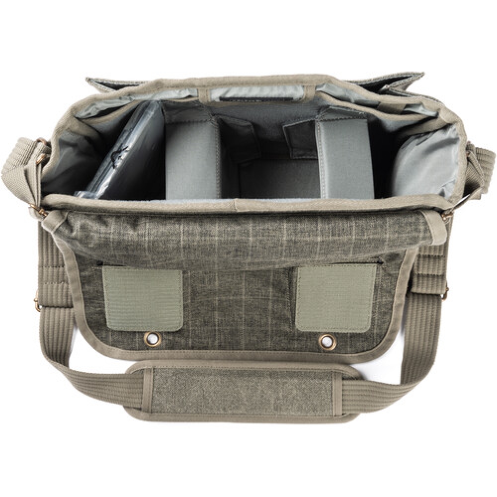 The bag is made of durable cotton canvas that has been treated for water resistance. It has a large flap with dual turn buckles to keep it securely closed and an interior nylon lining padded with closed-cell foam for protection. The main compartment has padded touch-fastening PE-reinforced dividers for organizing your gear. A large pocket under the flap will hold and organize memory cards, cables, your wallet, keys, and other smaller gear.