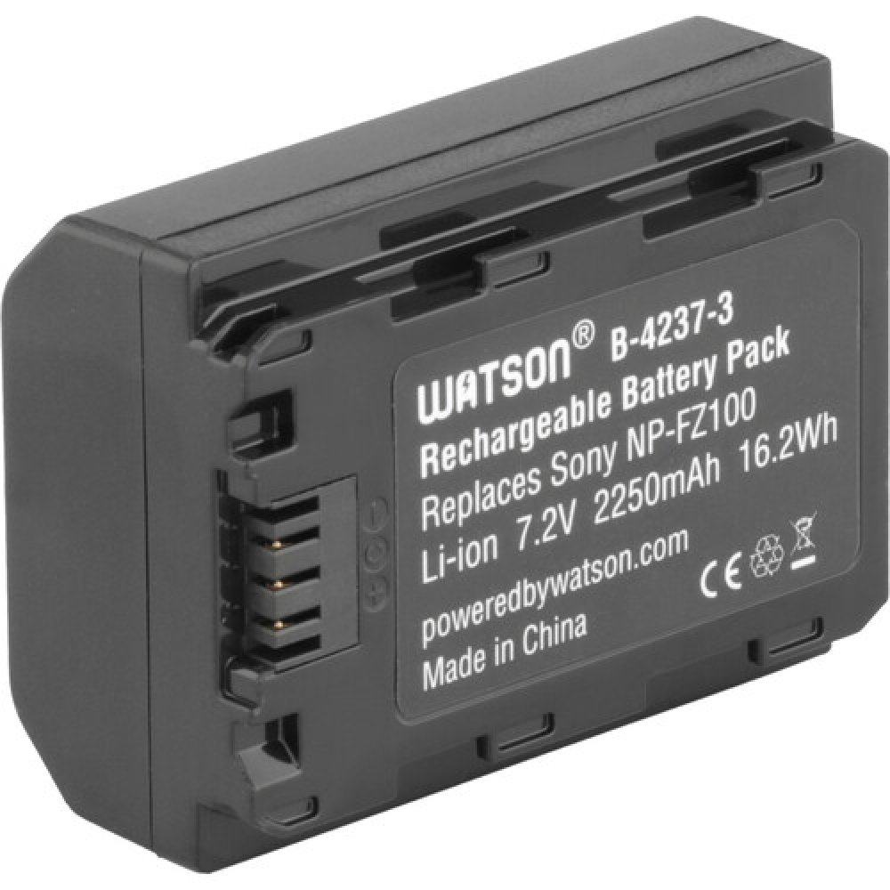The Watson NP-FZ100 V3 Lithium-Ion Battery Pack is compatible with the same camera models as the Sony NP-FZ100 battery, and also supports the latest generation camera models. This replacement battery pack features a capacity of 2250mAh, 7.2V of output power, and 16.2 watt-hours. Small and lightweight, lithium-ion batteries can be charged or discharged at any time in their load cycle without developing memory effect.